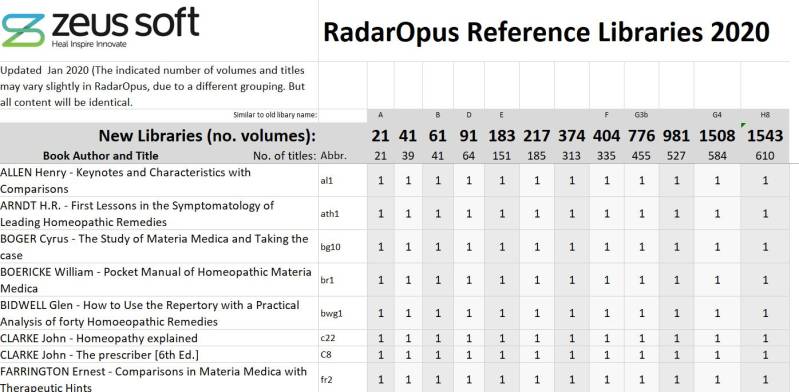RadarOpus bezit de grootste homeopathische bibliotheek die ooit bijeen gebracht is. Er zijn niet alleen zeer veel materia medica titels maar ook filosofie, therapeutisch, casuistiek, tijdschriften en andere naslagwerken beschikbaar. Er zijn verschillende talen beschikbaar: Engels, Nederlands, Duits, Frans, Spaans, Portugees etc.
