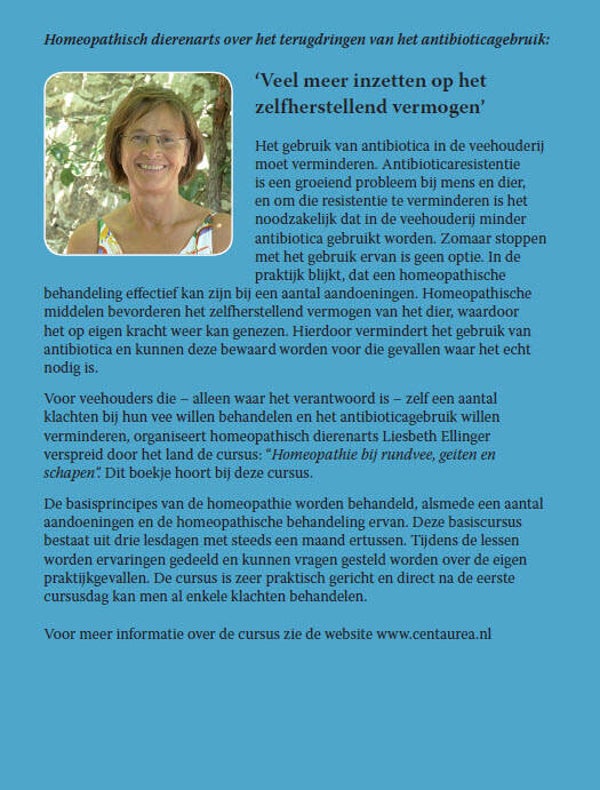 Liesbeth Ellinger geeft regelmatig cursussen over het gebruik van homeopathy by rundvee, geiten en schapen. Veehouders zijn zeer enthousiast over de resultaten, want op een goedkope en eenvoudige manier zijn veel problemen goed met homeopathie te behandelen.